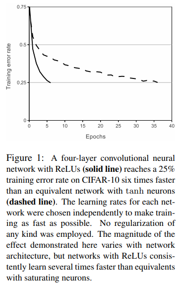 입력 x의 함수로써 뉴런의 출력 f를 모델링하는 표준 방법은 f(x)=tanh(x) 또는 f(x) = $(1+e^{-x})^{-1}$이다. gradient descent의 관점에서 이러한 saturating nonlinearity는 non-saturating nonlinearity f(x) = max(0,x)보다 훨씬 느리다. 이러한 non-saturating nonlinearity를 가지는 뉴런을 ReLU(Recrected Linear Units)라고 한다. ReLU를 사용하는 Deep convolutional neural networks는 tanh units을 사용하는 것보다 몇 배 더 빨리 훈련된다.