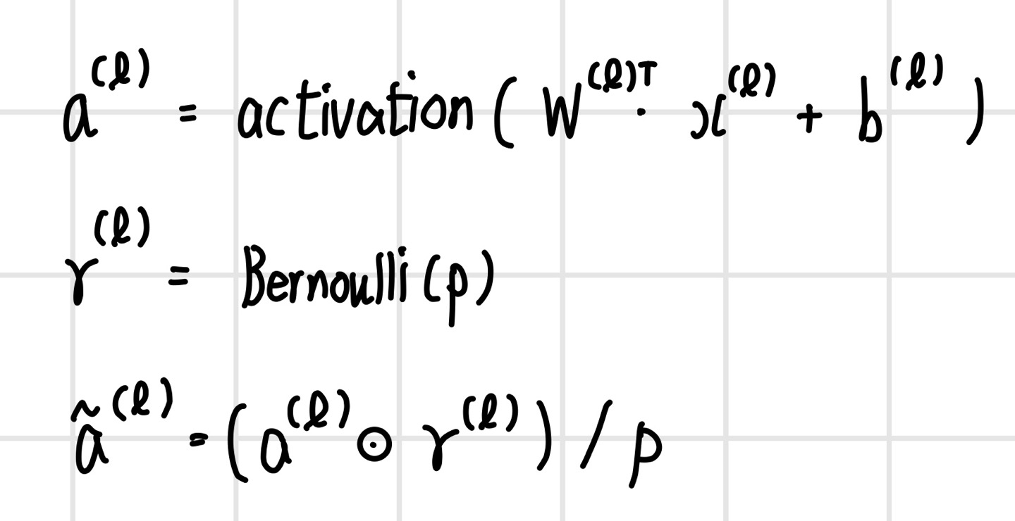 드롭아웃은 미니배치를 실행할 때마다 뉴런을 랜덤하게 잘라내서 새로운 모델을 생성한다. 뉴런을 드롭아웃할 때는 뉴런의 50% 이상은 유지되어야 하며, 입력 계층과 은닉 계층에 적용한다. 뉴런을 유지할 확률은 입력 뉴런은 0.8, 은닉 뉴런은 0.5 정도로 지정한다. 훈련 단계에서 드롭아웃을 적용하기 위해서 계층별로 뉴런의 `이진 마스크(binary mask)`를 생성한다. 이는 뉴런별 드롭아웃 여부를 나타내며 뉴런의 마스크값이 1이면 뉴런은 유지되고 마스크값이 0이면 드롭아웃된다. 이진 마스크의 0과 1의 비율은 뉴런이 유지될 확률에 따라 정한다. 이후 계층의 출력에 이진 마스크를 곱하면 드롭아웃이 실행된다.