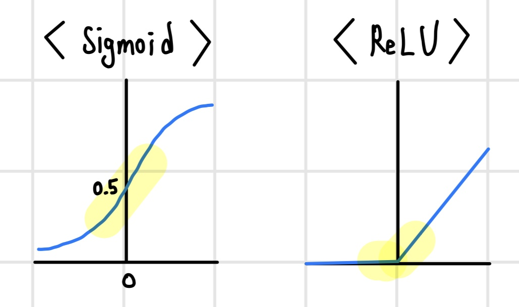 - 입력 데이터가 0 근처의 작은 값이라 가정하면 이는 시그모이드 계열의 활성 함수의 가운데 부분을 지나간다.