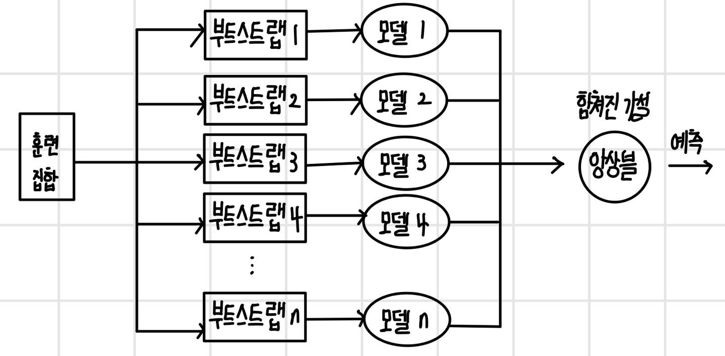 배깅은 모델의 종류와 관계없이 다양한 모델로 팀을 구성할 수 있다. 같은 종류의 모델로 팀을 구성하기도 하며, 다른 종류의 모델로 구성하기도 한다. 하지만 성능을 높이기 위해선 모델 간에 독립을 보장해야 한다. 모델의 독립성을 보장하기 위해 훈련 데이터를 `부트스트랩(bootstrapping)`하여 모델별로 부트스트랩 데이터를 생성한다. 부트스트랩 하는 과정에서 훈련 데이터에서 복원 추출을 하기 때문에 동일한 데이터가 다시 추출될 수 있으며, 일반적으로 부트스트랩 데이터의 크기는 훈련 데이터와 동일하게 한다.