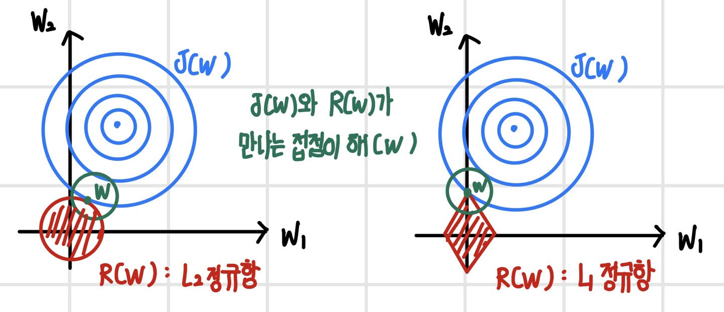 L2 정규화와 L1 정규화의 효과는 약간 다르다. 다음 그림은 가중치 감소 정규화를 적용했을 때 해의 위치를 나타냈다. 손실 함수와 각 정규항이 만나는 접점이 가중치 감소를 적용한 확장된 손실 함수의 해가 된다. L2 정규화의 경우 손실 함수 J(W)가 어느 방향에 있던 L2 정규항과 닿을 확률은 같기 때문에 최적해는 원점 주변에 존재한다. 그러나 L1 정규화의 경우 손실 함수가 L2 정규항의 모서리에 먼저 닿을 확률이 사선에 닿을 확률보다 높기 때문에 최적해가 특정 차원의 축 위에 있을 가능성이 높다. 이 경우 최적해가 존재하는 축을 제외한 나머지 축의 좌푯값은 0이 되므로, 좌표의 대부분이 0이 되어 희소한 해를 가지게 된다. 가중치가 희소해지면 일부 가중치가 0이 되어 유효 파라미터 수가 줄어들고 작은 모델이 되어 성능이 빨라진다. 이러한 과정은 `유효한 특징을 선택(Feature Selection)`하는 과정으로도 볼 수 있다.