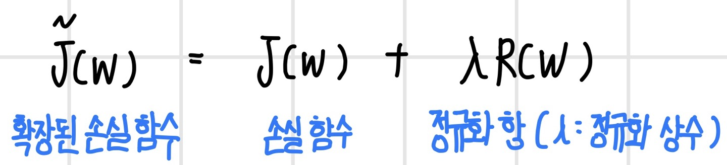 가중치 감소는 가중치의 크기를 제한하는 제약 조건으로 손실 함수의 일부 항으로 표현할 수 있다. 즉, 다음 식과 같이 손실 함수로 확장해서 가중치의 크기를 표현하는 `정규화 항(regularization term)`을 더하면 최적화 과정에서 손실 함수와 함께 정규화 항도 같이 최소화되므로 크기가 작은 가중치 해를 구할 수 있다. 여기서 람다(lambda)는 정규화 상수로서 가중치 크기를 조절하는 역할을 한다. 이 값이 커질수록 정규화 항의 비중이 커지면서 가중치 크기는 작아지고, 값이 작아지면 정규화 항의 비중이 작아지면서 가중치 크기는 커진다. 따라서 이 값에 따라 유효한 가중치의 개수가 달라질 수 있기 때문에 모델의 복잡도를 조정하는 역할을 한다고 볼 수 있다.