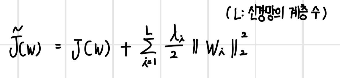 또한 가중치 그룹별로 가중치 크기를 조절하고 싶다면 가중치 그룹별로 정규화 항을 분리해서 합산 형태로 표현한다. 이를 통해 신경망의 계층별로 가중치 크기가 다른 경우 통제가 가능하다.