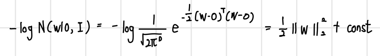 해당 식에서 가중치의 사전 분포가 가우시안 분포일 경우 음의 로그 우도를 취했을 때 가중치의 L2 노름의 제곱이 도출된다.