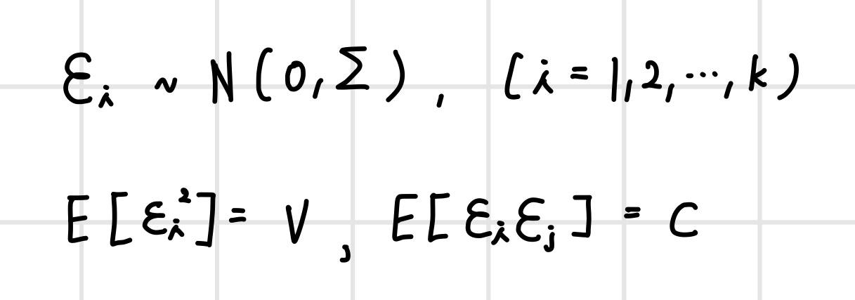 배깅의 정규화 효과를 확인하기 위해 k개의 회귀 모델로 배깅한다고 가정한 경우 개별 모델의 예측 오차가 배깅에서 어떻게 줄어드는지 확인해보면 다음과 같다. 이 경우 개별 회귀 모델의 예측 오차는 평균이 0이고 분산이 v이며 모델 간의 공분산이 c인 가우시안 분포를 따른다.