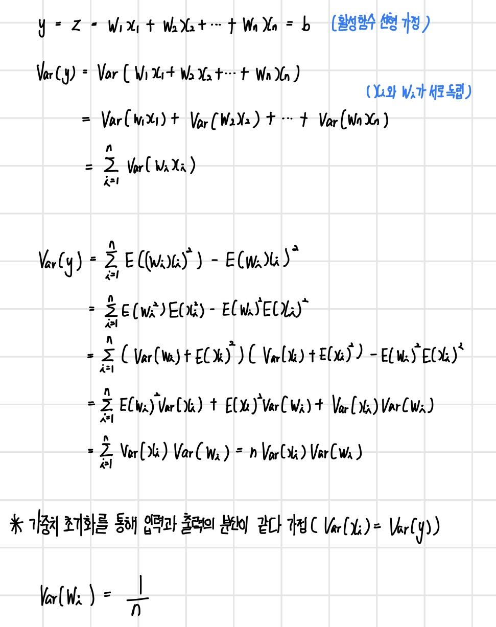 이러한 가정 속에서 Xavier 초기화 식을 유도해보면 다음과 같다.