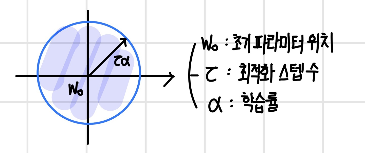 조기 종료는 파라미터 공간을 작게 만드는 효과가 있다. 다음 그림과 같이 파라미터 공간은 초기 파라미터 위치를 중심으로 제약된다. 조기 종료로 파라미터 공간의 크기가 제약되면 L2 정규화와 동일한 효과가 있다. 만약 손실 함수가 2차 함수로 정의되는 선형 모델의 경우 조기 종료와 L2 정규화는 동일하다.