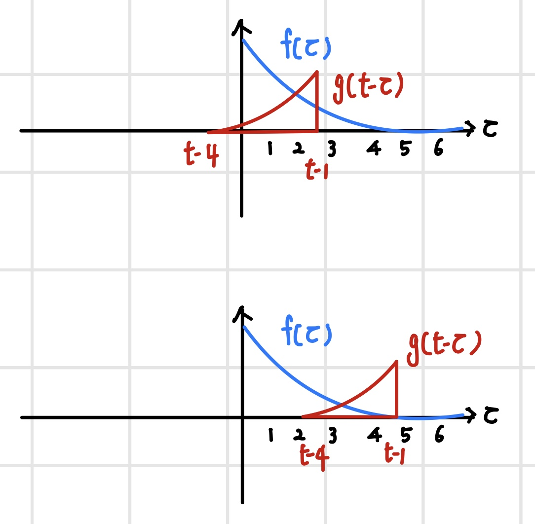 컨벌루션 연산을 위해 두 함수를 임시 변수에 대한 함수로 재정의하고 컨벌루션 필터 g(t)를 반전시킨다.