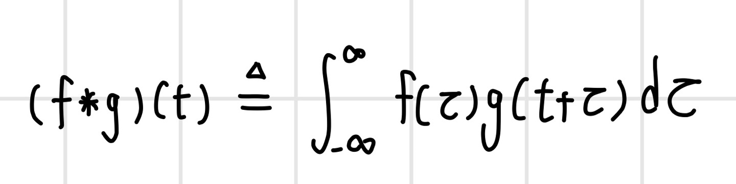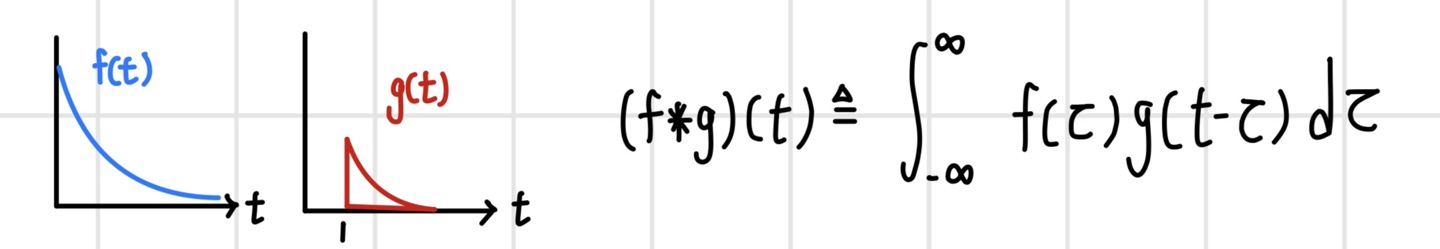 `Convolution`은 두 함수를 곱해서 적분하는 연산으로, 함수 f에 다른 함수 g를 적용하여 새로운 함수를 만들 때 사용한다. 두 연속 함수 f(t)와 g(t)가 있다고 할 때 두 함수의 컨벌루션 연산은 다음과 같은 적분식으로 정의한다. 이때 함수 g(t)는 `convolution filter` 또는 `convolution kernel`이라고 부른다. 여기서 변형하려는 함수와 컨벌루션 필터 함수의 역할을 반대로 해도 결과값은 동일하다.