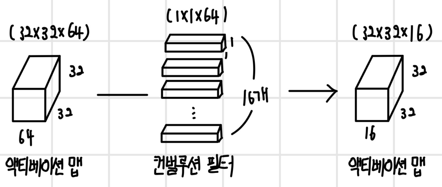 `점별 컨벌루션(pointwise convolution)`은 가로 x 세로 크기가 (1 x 1)인 컨벌루션 필터를 사용하기 때문에 `1 x 1 컨벌루션`이라고 부르기도 한다. 점벌 컴벌루션은 픽셀별로 채널에 대해서만 컨벌루션하기 때문에 액티베이션 맵의 가로 x 세로 크기는 변하지 않고 채널 수만 달라진다. 점별 컴벌루션을 사용하면 채널 특징을 학습할 수 있으며 죽은 채널의 영향을 줄일 수 있다. 또한 채널 수를 줄이거나 늘릴 수 있어서 컨벌루션 계산량을 조절할 때 사용한다. 점별 컨벌루션은 `인셉션(inception)`, `레즈넷(ResNet)`, `모바일넷(MobileNet)`, `스퀴즈(SqueezeNet)`과 같은 CNN 모델에서 사용한다.