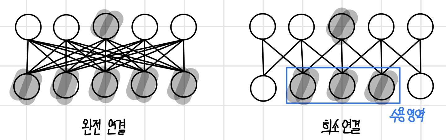 만약 매우 강한 사전 분포가 가정되지 않았다면 뉴런이 모든 입력에 대해 연결을 갖는 `완전 연결(full connectivity)`을 가진다. 입력이 m개이고 뉴런이 n개이면 전체 파라미터 수는 O(m x n)이 된다. 그러나 매우 강한 사전 분포가 가정된 컨벌루션 신경망에서는 뉴런이 입력 데이터의 국소 지역에만 연결되는 희소 연결을 가진다. 이 경우 뉴런의 개수가 n이고 뉴런에 연결된 입력의 개수가 k이며 전체 파라미터 수는 O(n x k)이다. 여기서 k개는 완전 연결의 입력 m보다 아주 작은 수이기 때문에 희소 연결을 가지면 파라미터가 줄고 메모리와 계산이 절약된다.