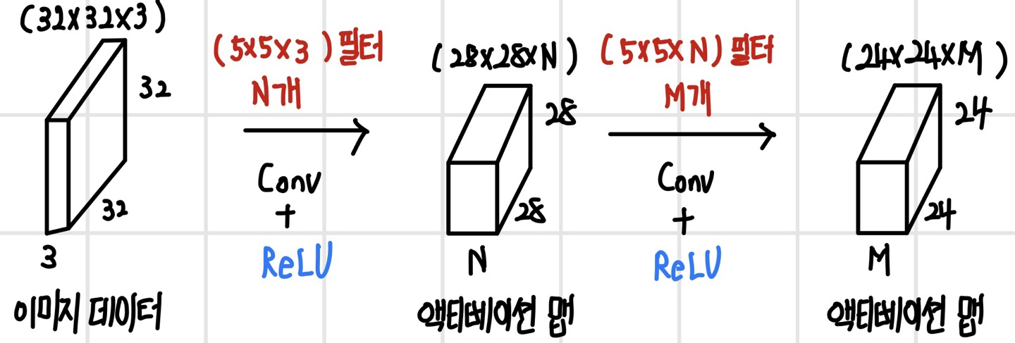 첫 번째 계층에서 출력된 (28 x 28 x N) 크기의 액티베이션 맵은 두 번째 계층의 입력 데이터가 되어 또 다른 컨벌루션 연산을 수행한다. 이때 앞서 첫 번째 계층에서 입력 데이터인 이미지 데이터의 채널 수와 컨벌루션 필터의 채널 수가 동일해야 했던 것처럼 두 번째 계층에서도 입력 데이터인 (28 x 28 x N) 크기의 액티베이션 맵의 채널 수인 N과 두 번째 계층의 컨벌루션 필터의 채널 수는 동일하게 N이어야 한다. 또한 두 번째 계층의 컨벌루션 필터의 개수가 M개이면 채널의 수가 M개인 액티베이션 맵이 만들어진다. 결론적으로 두 번째 계층에서는 (28 x 28 x N) 크기의 입력 데이터를 M개의 (5 x 5 x M) 크기의 컨벌루션 필터로 컨벌루션 해서 (24 x 24 x M) 크기의 액티베이션 맵을 얻게 된다.