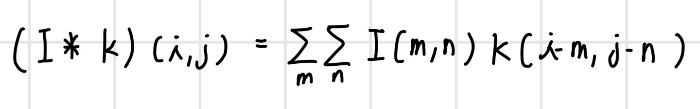 이미지에 대한 컨벌루션은 이미지의 특징을 추출하거나 이미지를 변환할 때 사용한다. 예를 들어 `경계선 검출(edge detection)`, `스무딩(smoothing)`, `샤프닝(sharpenng)`과 같은 이미지 처리가 있다. 이미지에 대한 컨벌루션 연산을 식으로 정의해 보면 다음과 같다. 2차원 이미지가 I이고 컨벌루션 필터가 K이다. 이미지는 입력 함수가 되고 컨벌루션 필터는 가중치 함수가 되어 픽셀 단위로 가중 합산을 한다. 여기서 함수의 인자 (i, j)는 픽셀 인덱스이다.