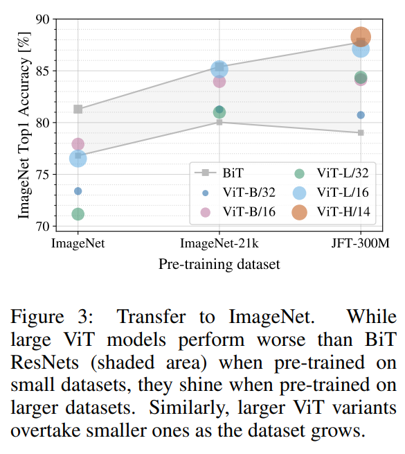 - 그러나 데이터 세트의 크기가 커질수록 ViT 모델이 BiT보다 성능이 앞서며, 더 큰 ViT 모델이 효과가 있음